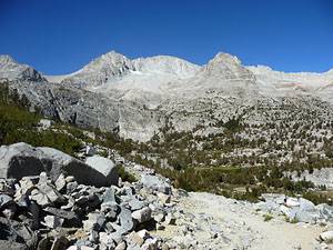 Morgan Pass (11,110-ft.), reached 3.7 miles from the trailhead, enjoys stunning views of Mount Dade, Mt Abbot and Treasure Mountain towering above the Gem Lakes basin. Steep scree covered slopes rise above a narrow valley to the east of the pass where the trail descends through a massive boulder field to Upper Morgan Lake (10,940-ft.) in half a mile and Lower Morgan Lake (10,700-ft.) in a mile. The trail eventually leads to the Pine Creek trailhead.