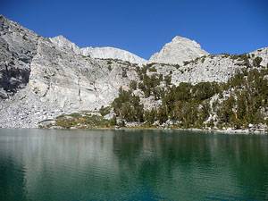 Beyond the small tarn the trail wanders through scattered pines, scrub growth and granite outcroppings to the east shore of the largest Gem Lake. This beautiful alpine jewel lies cradled in a granite bowl surrounded on three sides by steep granite cliffs. The tops of Mount Dade, Mt Abbot and Treasure Mountain peak above the granite ridge to the west.
