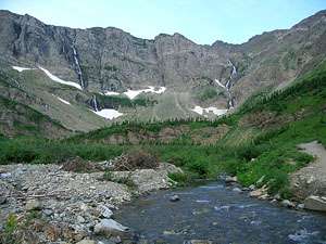 Beyond the falls the trail continues ascending the valley on easy grade, passing through stands of trees and pretty meadows with fine views of Mt. Wilbur to the north, Mt. Grinnell to the south and Swiftcurrent Glacier, cradled atop a ledge near the top of the valley’s headwall. Waterfalls emanating from the glacier tumble down crevasses in the sheer headwall.